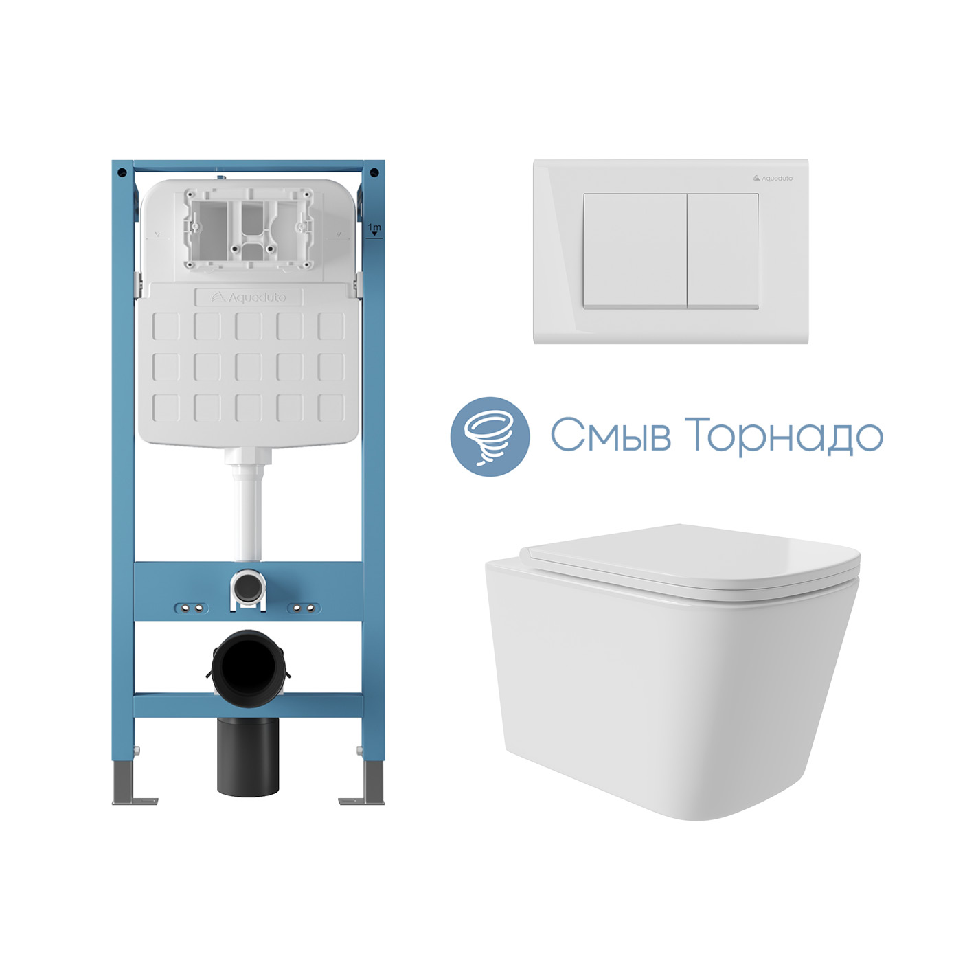 Aqueduto комплект: TECNICA Novo Система инсталляции для подвесного унитаза, QUADRADO Панель смыва, белый глянцевый, MACIO Plus Унитаз подвесной 520*365 безободковый, Tornado, сиденье с микролифтом, белый глянцевый