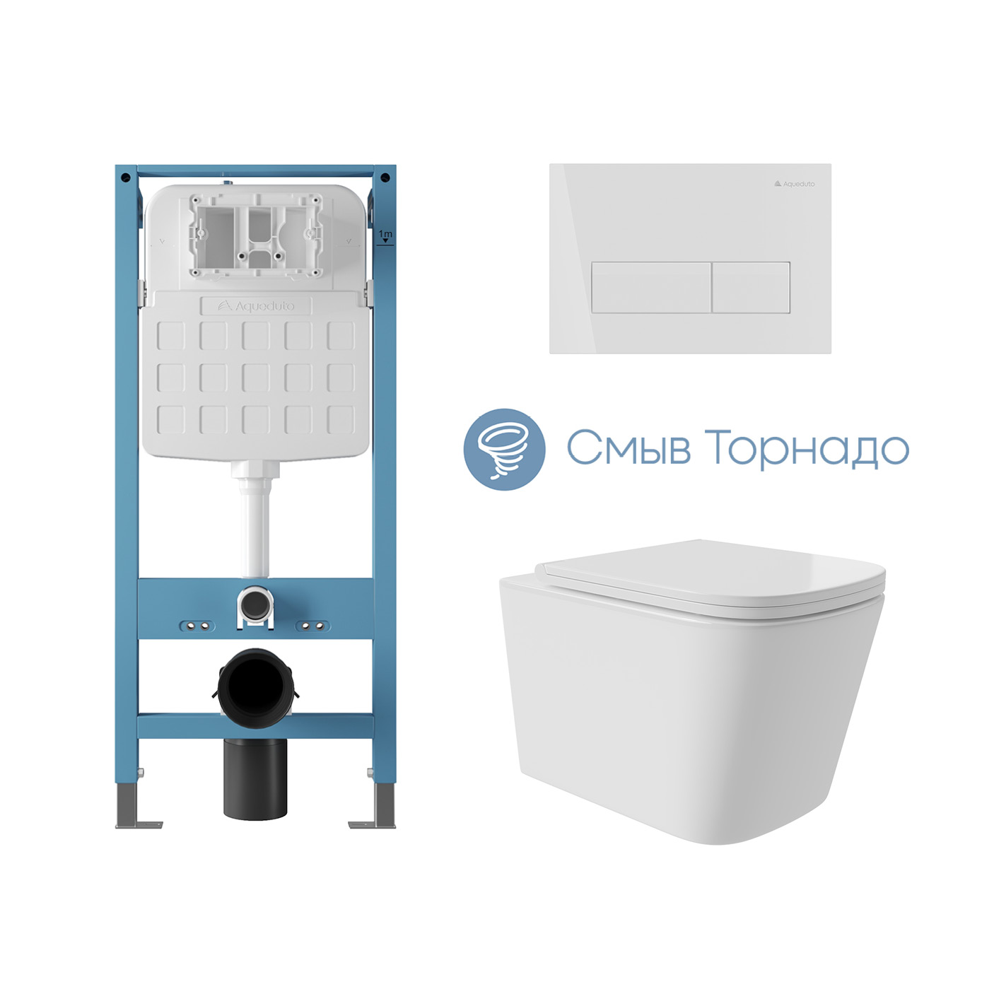 Aqueduto комплект: TECNICA Novo Система инсталляции для подвесного унитаза, RETANGULO Novo, Панель смыва, белый глянцевый,MACIO Plus Унитаз подвесной 520*365 безободковый, Tornado, сиденье с микролифтом, белый глянцевый
