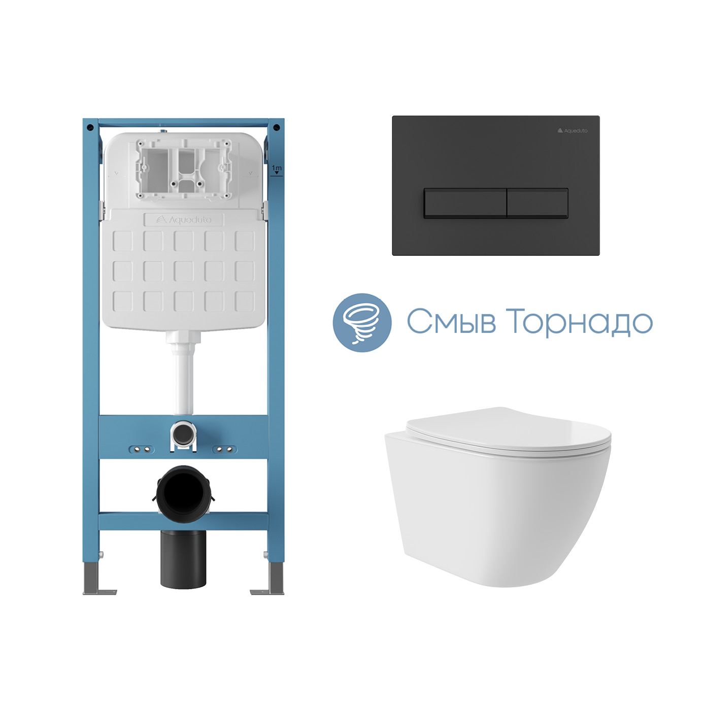 Aqueduto комплект: TECNICA Novo Система инсталляции для подвесного унитаза, RETANGULO Панель смыва, черный матовый, OVO Plus Унитаз подвесной 520*365 безободковый, Tornado, сиденье с микролифтом, белый глянцевый