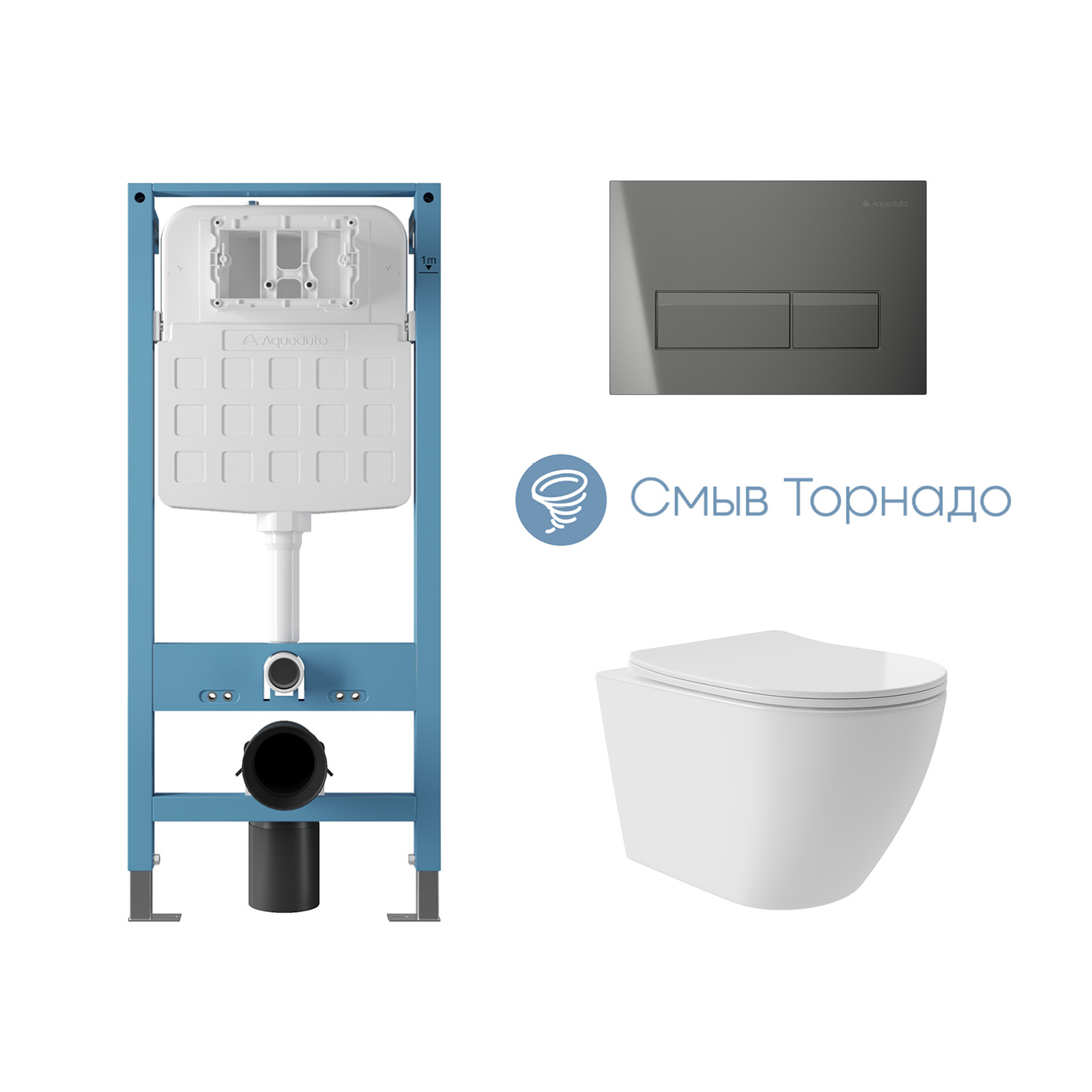 Aqueduto комплект: TECNICA Novo Система инсталляции для подвесного унитаза, RETANGULO Novo Панель смыва, оружейная сталь, OVO Plus Унитаз подвесной 520*365 безободковый, Tornado, сиденье с микролифтом, белый глянцевый