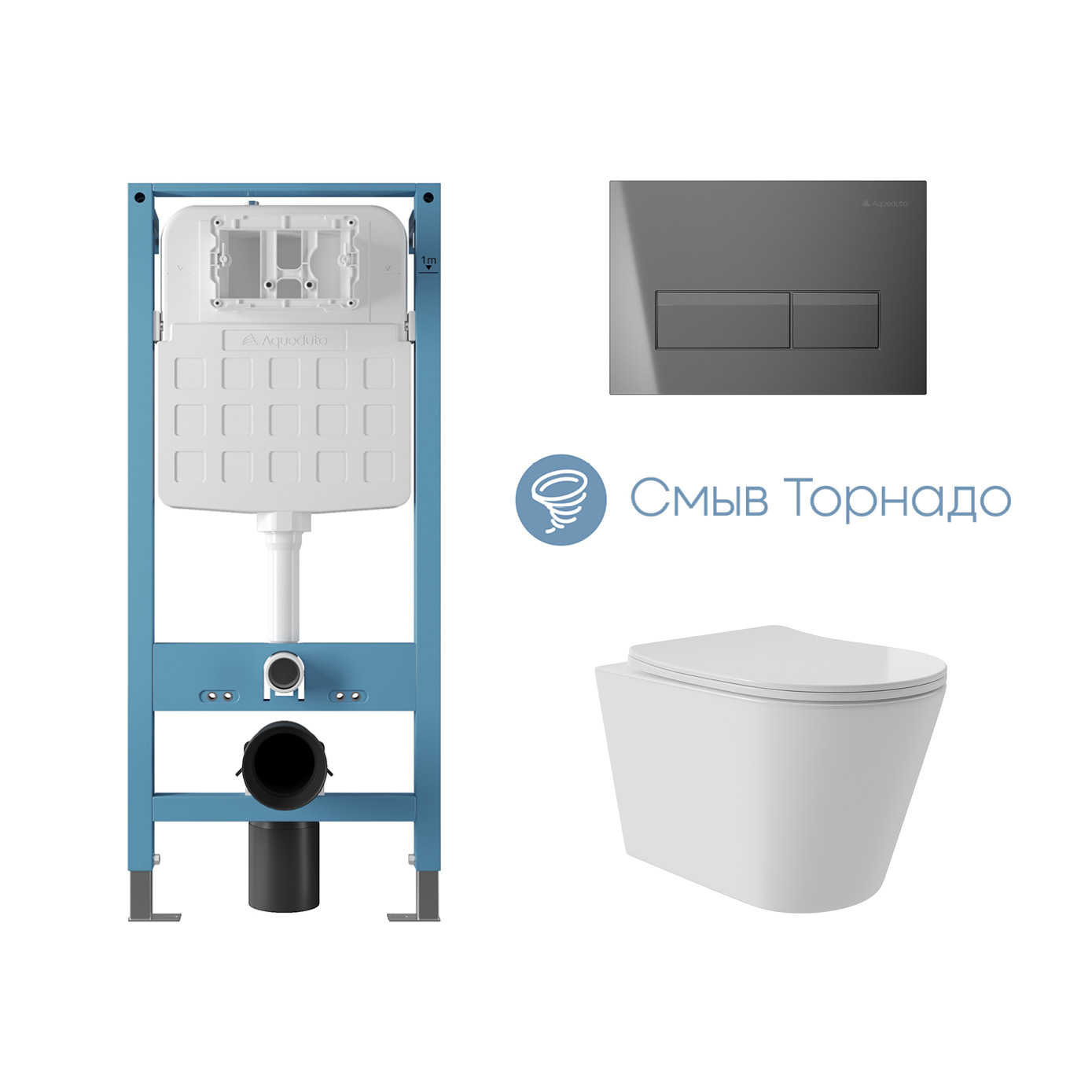 Aqueduto комплект: TECNICA Novo Система инсталляции для подвесного унитаза, RETANGULO Novo Панель смыва, оружейная сталь, CONE Plus Унитаз подвесной 520*365 безободковый, Tornado, сиденье с микролифтом, белый глянцевый